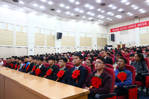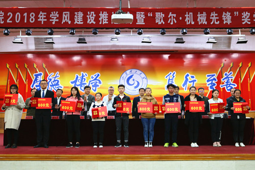 会上,学院副院长赵国勇宣读表彰决定,对获奖学生表示祝贺,与会嘉宾为先进个人及集体颁奖。随后,学生代表上台发言,表达对学院及歌尔集团的感激,并表示将不忘初心,立志成才。