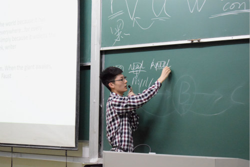 随后,刘一铭上台讲解考研英语。刘一铭表示,作为非英语专业的学生,他与渴望掌握英语的同学们感同身受。在了解学生们学习英语方法的混乱和低效后,他结合自身学习英语的经验,为学生们提供正确的学习规划策略,帮助大家高效提高英语水平。活动中,他给在场拟考研学生分发考研英语试题,并根据近几年英语试题将各个题型进行详细分析,具体讲解其简便做法与得分技巧,同时着重对英语试题中的高频知识点进行反复讲解。