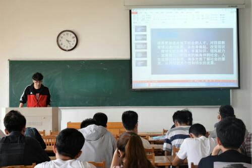 答辩会开始,答辩者依次进行答辩,台上展示学生引经据典、或妙语连珠、或逻辑严密、或理论联系实际,面对评委老师镇定自若,从调研背景、目的、意义等方面进行陈述,展示解说自己的暑假社会实践项目计划。台下评委和观摩的学生认真聆听。在座评委朱峰与王昌忠对每位计划设计者提问,提出许多有价值的问题同队员们探讨, 还结合自身经验帮团队指出实践中不足之处。
