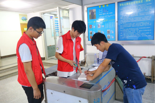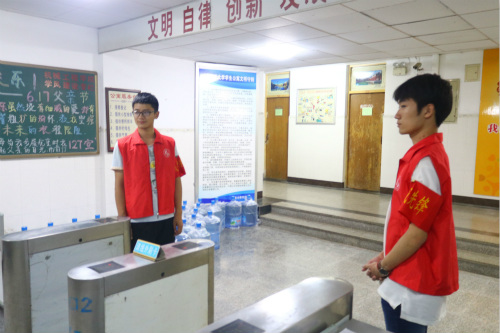 毕业生党员有序站在无障碍通道系统处监督同学进出情况,对无卡出入的同学做出询问、记录,并对不规范刷卡行为及时指正。他们身穿红色工作服,一丝不苟的清查回寝人数,对夜不归宿人员进行记录、上报,以便应对各种突发事件和保障每位同学的人身安全,充分发挥带头作用,坚决服从组织安排。