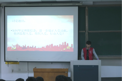 讨论开始,朱峰就专业知识学习和模范作用发挥的结合点进行了阐述,并指出所有党课学员首先是一名大学生,学习是天职,所以扎实学好自己的专业知识;同时,每一位党课学员要时刻谨记自己是一名入党积极分子,所以必须要进一步端正自己的入党动机,牢牢掌握党的政治理论知识,提高自身政治理论素质。随后,进行小组讨论,小组人员围绕讨论专题各抒己见,畅所欲言,仁者见仁,智者见智,不断碰撞出激烈的思想火花。接着,分小组派出代表对小组讨论结果进行总结陈述,各代表的陈述条理清晰,简短凝练地总结小组最终讨论结果。