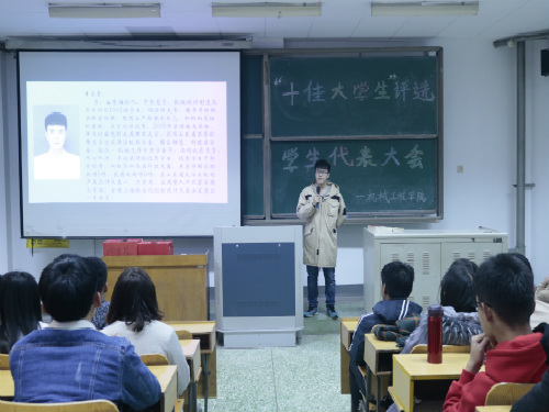 此次评选活动在前期个人自荐与组织推荐的基础上,经过材料审核,研究确定出3位“十佳大学生”提名候选人,分别为机制1503李法贵、机电1503唐浩程、机创1501管延超。活动开始,刘祥生简要说明投票流程及注意事项,随后,三位候选人依次上台结合PPT进行个人陈述及答辩,自荐内容包括曾任与现任职务、做事态度、学生工作、实践经历、获得奖项等方面。自荐过程中,与会学生代表仔细观看三位候选人PPT简介,为接下的投票做好准备,以表示投票环节的公正性。与会学生通过听取宣讲,了解候选学生的各方面,为接下来的投票做准备。