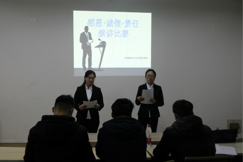 12月14日下午,williamhill英国中文在12号教学楼535会议室举办“感恩·诚信·责任”演讲比赛。此次活动由williamhill英国中文就业部部长苏文星、资管部部长姜浩、科创部部长张茂盛担任活动评委,学院部分学生参加。
