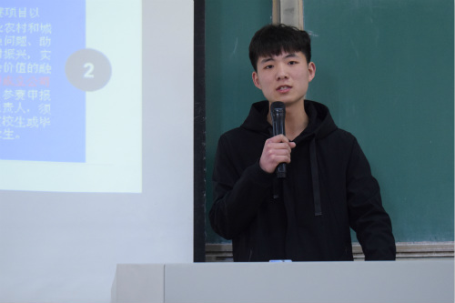 活动伊始,张思状以“敢为人先放飞青春梦,勇立潮头建功新时代”为主旨介绍活动目的,他提到,“互联网+”是培养大学生创新创业精神,探索素质教育新途径,搭建成果展示新平台综合性比赛。随后,他以支付宝、淘宝、百合网等由“互联网+”与传统相结合而成新型方式为例,讲述其概念及对人们生活的影响。宣讲中,他引用李克强总理对创新创业型比赛重要批示介绍此次比赛背景,以时间为节点介绍比赛发展历程。他提到,“互联网+”发展趋势只增不减,大量“互联网+”模式爆发以及传统企业“破与立”,比赛通过限制组队条件与项目元素使大赛顺利开展。其中项目元素分为现代农业、信息技术服务、社会服务等五点,并于主赛道下设多种组队形式。大赛总体安排遵循“五个更”原则,即更全面、更国际、更中国、更教育、更创新。最后,他指出三点注意事项,一、参赛项目不只限于“互联网+”项目,鼓励各类创新创业项目参加;二、团队报名填写上的位次将作为后期证书上的人员位次,位次代表贡献率,不接受任意更改,三、高校教师科技成果转化的参赛项目不能参加创意组,但可参加其他组别。