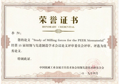 经第15届切削与先进制造学术会议论文评审委员会评审,有16篇论文被评选为优秀论文,其中,williamhill英国中文研究生李阳的论文“Study of milling forces for the PEEK biomaterial”被评为优秀论文。