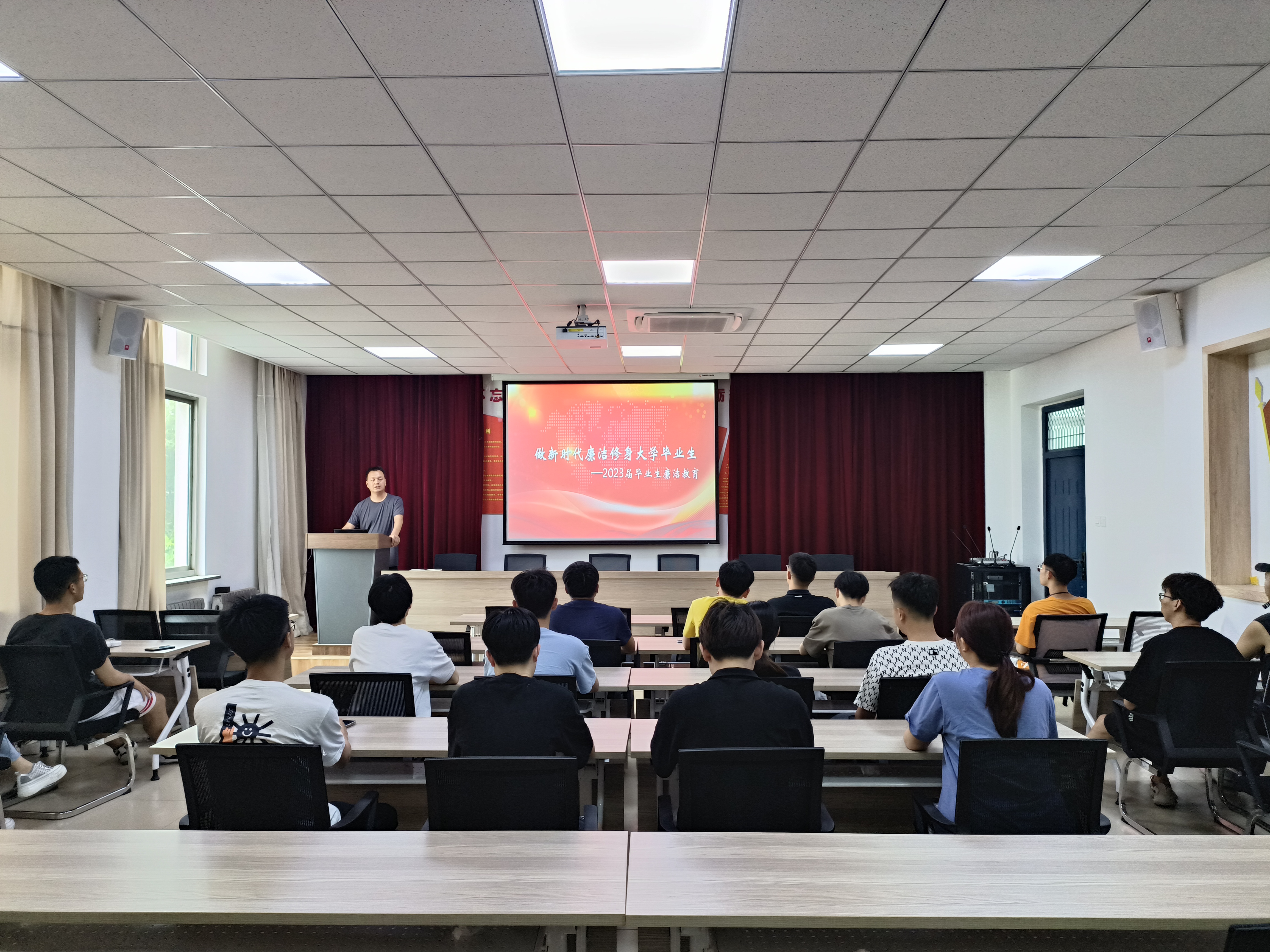 班会上,王予彬分享了“”一钱太守、“不私一钱”等中国古代廉洁小故事,勉励大家要坚定理想信念,筑牢思想底线,心系家国,对党忠诚;要知廉律己、倡廉力行、守廉担当,切实扣严扣实人生的“第一粒扣子”。会上,全体同学还共同观看了廉洁教育专题片《永远在路上》。毕业生代表机制1905班孙宁同学宣读了《清风启程 行稳致远----致2023届毕业生的廉洁从业倡议书》,倡议全体毕业生要坚定信念,廉洁润心;严于律己,廉洁修身;心存戒惧,廉洁从业。希望全体毕业生在激扬青春、成就人生、奉献社会的进程中踔厉奋发、笃行不怠,奋力在人生的赛道跑出最好的成绩。