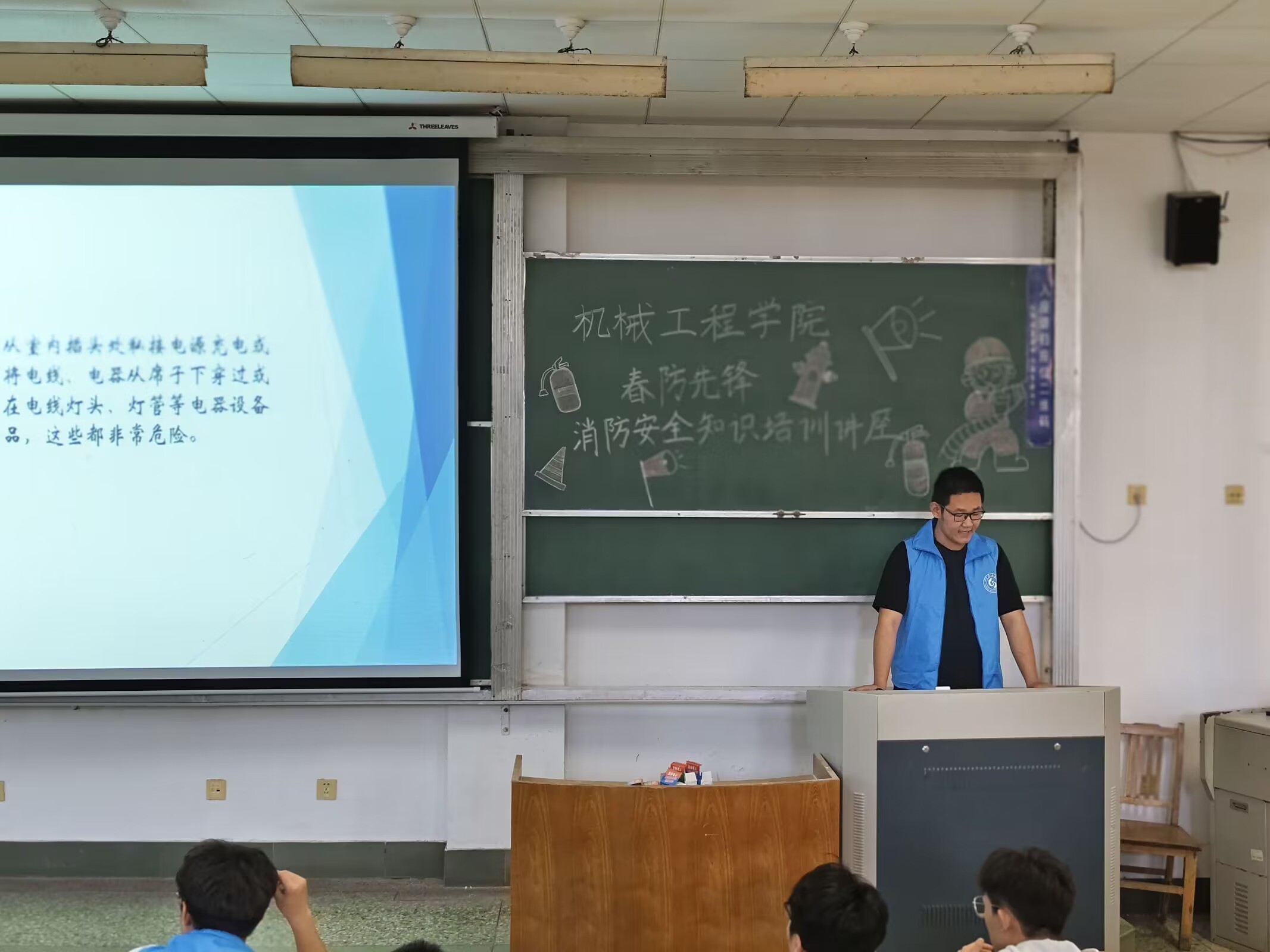 在消防安全常识知识方面,主讲同学详细介绍了发生火灾后如何准确报警和发生火灾时的注意事项;在消防器材使用方面,主讲同学详细介绍了干粉灭火器、二氧化碳灭火器等常见灭火器材的适用范围和使用方法。