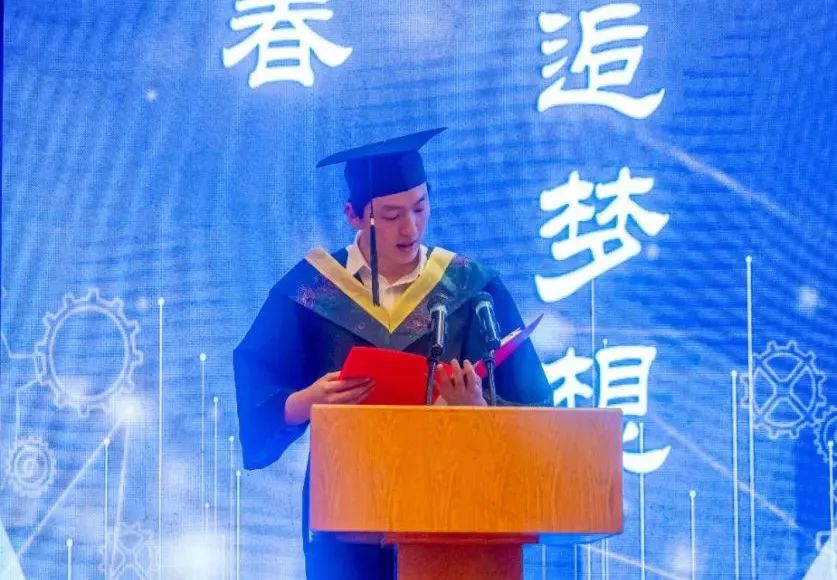 毕业生代表材控2001班李道原同学发言。他回顾了大学四年的际遇与成长,表达了对学校以及老师同学们的感谢之情,同时代表毕业生祝福母校和学院蓬勃发展,再续华章。