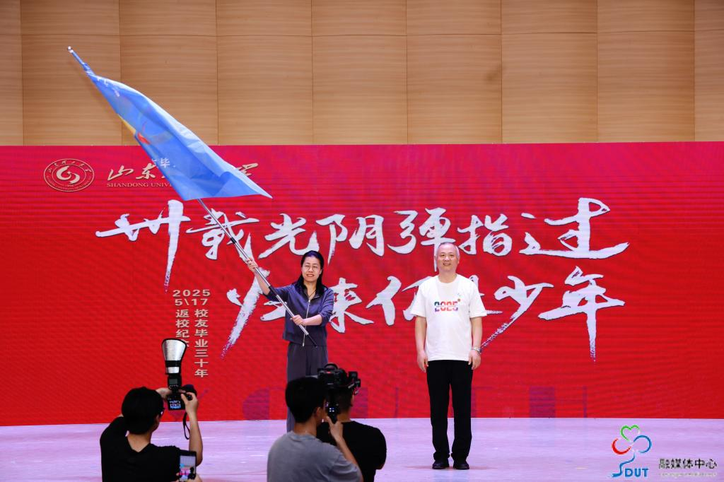 1995届机械工程(师范)专业校友王建兴与1996届国际贸易专业校友张海伟交接毕业30周年纪念旗帜,预示着母校70周年校庆活动进入一周年倒计时。