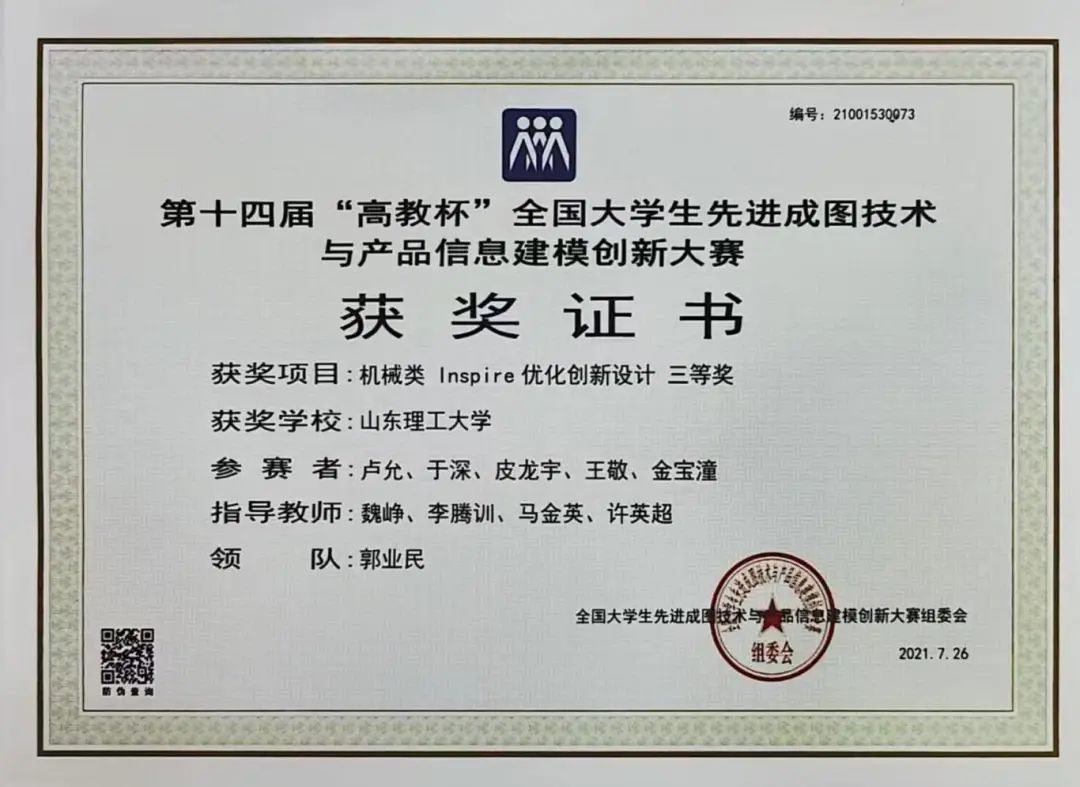 在学科竞赛传承之路上,第十四届“高教杯”全国大学生先进成图技术与产品信息建模创新大赛暨第一届轻量化赛道开赛,魏峥老师率先带队出征,首战摘得国家三等奖,为赛道探索奠基铺路。伴随赛事推进,秦榛老师接任主力。作为机械学会优秀指导教师,秦榛老师在产品轻量化设计教师培训获得一等奖 ,凭扎实专业接力前行,带领学生稳步突破,从国三、国二一路奋进至国一,机械学会指导老师接力书写轻量化设计与Al应用赛道的成长佳话。